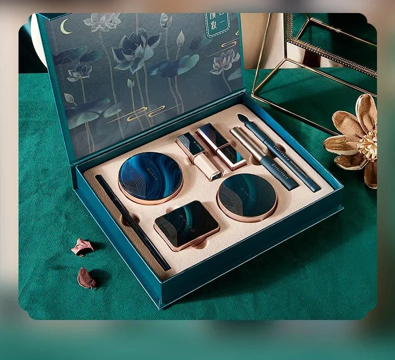 8pcs/set Chinese Style Lotus Pond MoonlightGift Box Makeup SetBest Christmas Present/Valentine's Day Present/Birthday Present For Women And GirlsPackage Include:1pcs*velvet lipstick1pcs*eyeliner pencil1pcs* bb cream1pcs liquid concealer1pcs setting powder1pcs mascara1pcs eyebrow pencil1pcs eyeshadow palette